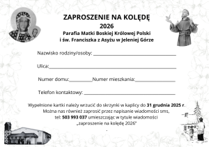 Odwiedzimy z kolędą te rodziny, tych mieszkańców, którzy zaprosili księży indywidualnie poprzez przygotowane zaproszenia imienne. Jeśli jeszcze tego nie zrobiliśmy, a życzymy sobie wizyty to z tyłu kaplicy są jeszcze kartki. Prosimy o ich wypełnienie. Dzień wcześniej otrzymacie drodzy informację sms o wizycie kolędowej.